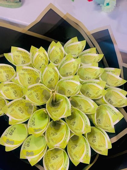 - Money bouquet ideas with Indian currency, folded into floral shapes - super popular for weddings.