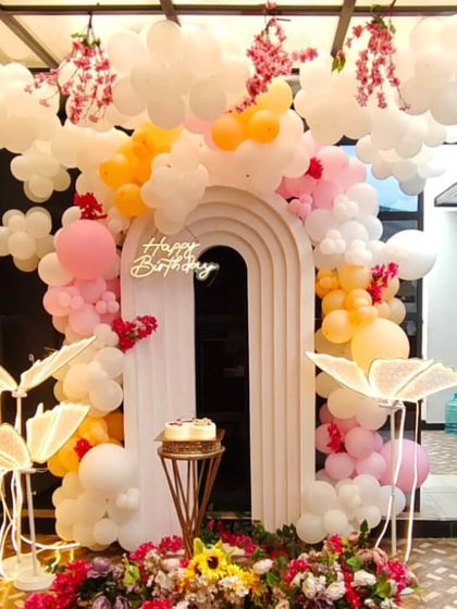 - Decor: Artificial floral bunches attached to the ring and fairy lights interwoven in the balloons.