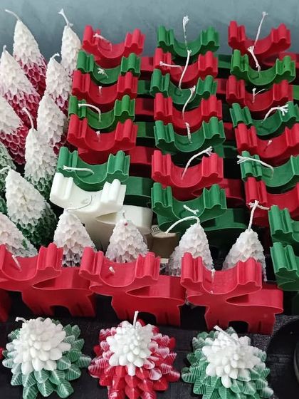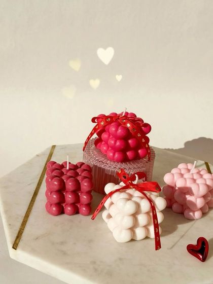 We handcraft sculptural soy wax candles in unique shapes like flowers, abstract forms, and Indian sweets, with options for custom scent, color, and bulk orders.