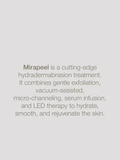 MiraPeel is an advanced hydradermabrasion system that combines gentle exfoliation, serum infusion, and microcurrent technology. It is a non-invasive treatment designed to improve skin texture, combat fine lines, and treat pigmentation with minimal downtime.