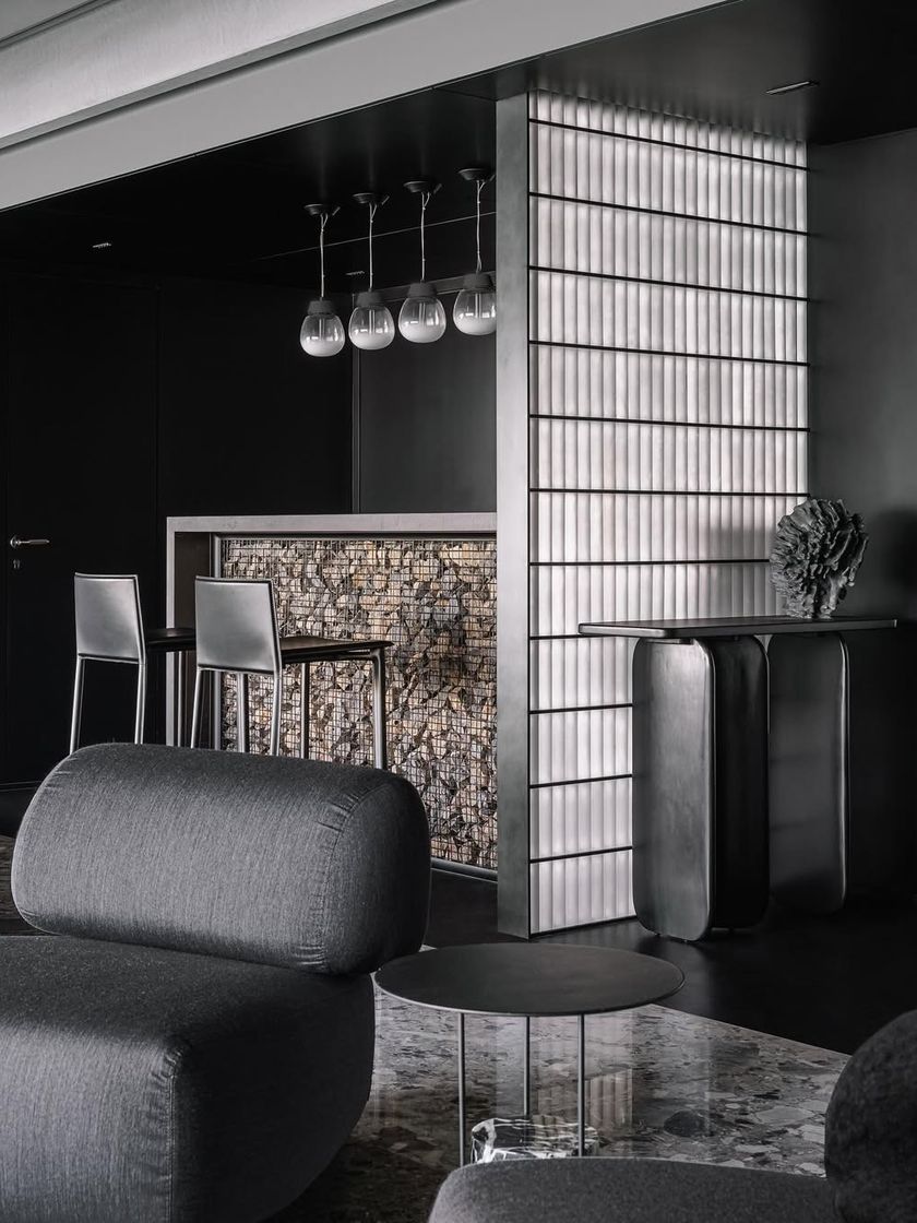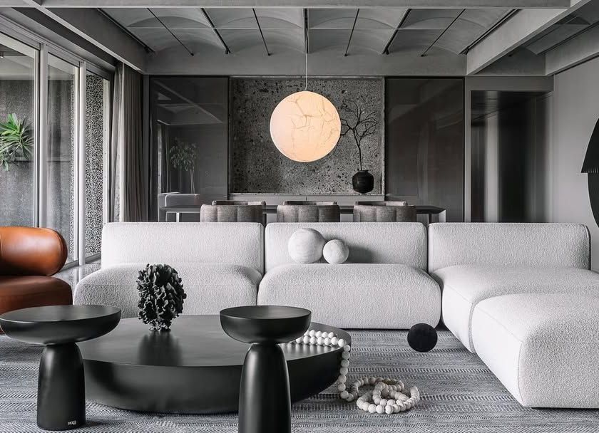 This project is an exploration of volume, texture, and light within a refined grey scale. We used architectural elements like vaulted ceilings and sliding panels to control the scale of large spaces, creating an environment that is both monumental and intimate, inspired by Brutalist and Scandinavian design principles.