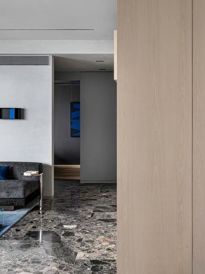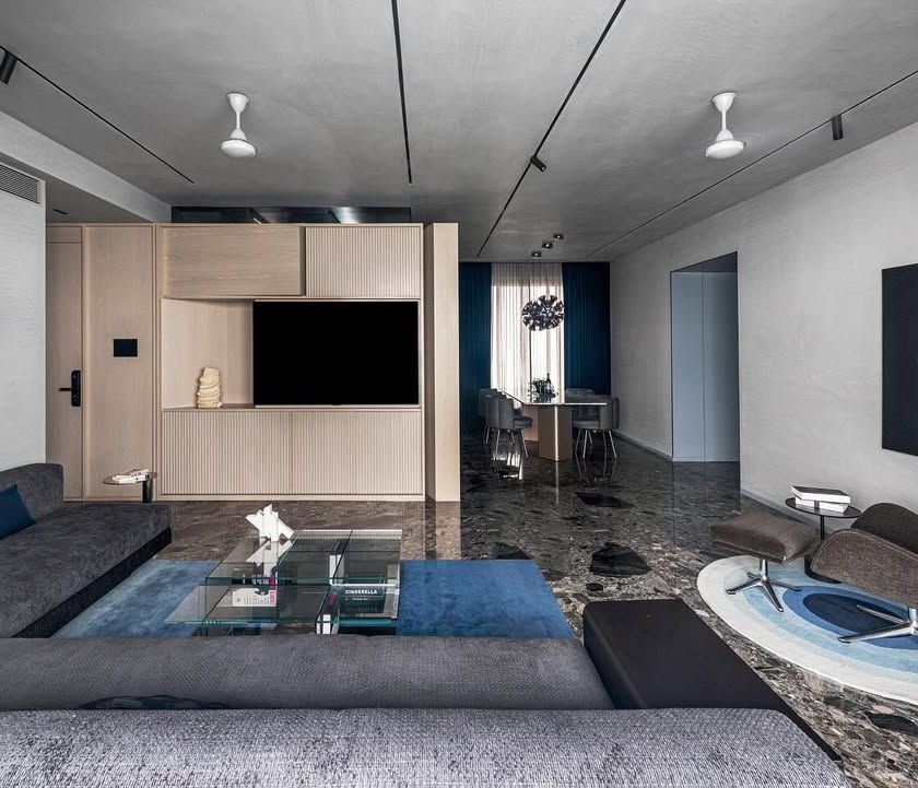 In this residence, we explored the language of soft curves and angular lines, using a monochrome palette of greys as a canvas for strategic pops of 'Azul' blue. The design focuses on creating fluid, interconnected spaces through elements like curved partitions and monolithic furniture, balancing minimalism with warmth.