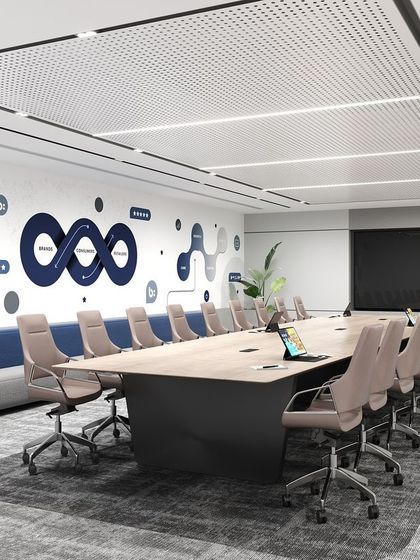 - Lighting: Layered lighting design including linear architectural profile lights and pendant lamps in breakout zones.
