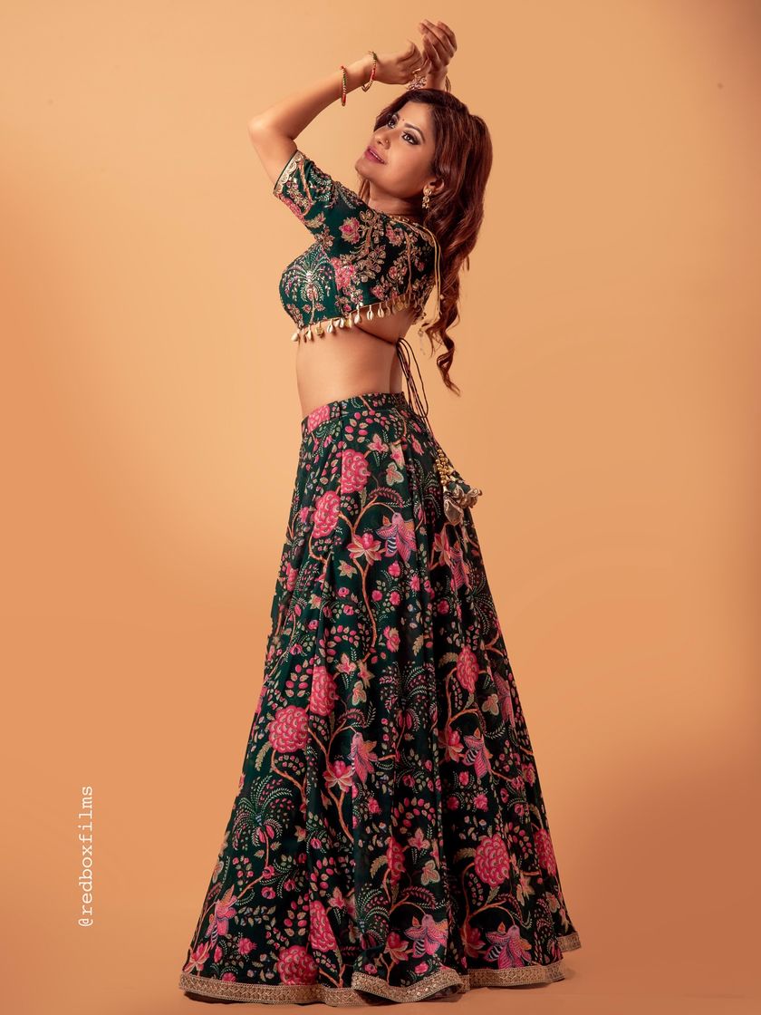 We create a wide range of lehengas for any occasion. This includes heavy bridal lehengas with intricate gold work, light and vibrant floral printed sets for pre-wedding functions, and elegant Chikankari lehengas.
