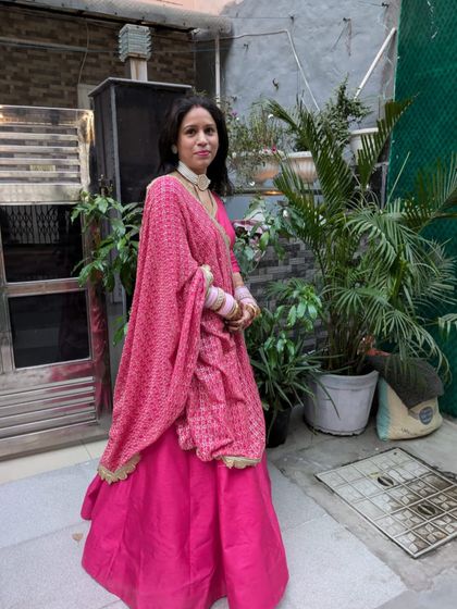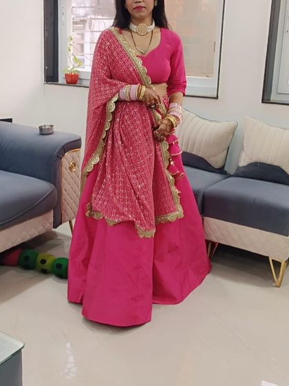 I specialize in creating exquisite traditional Indian garments, particularly lehengas and sarees. My designs feature intricate hand embroidery with floral patterns using gold and white thread work, combined with premium fabrics like silk and satin.