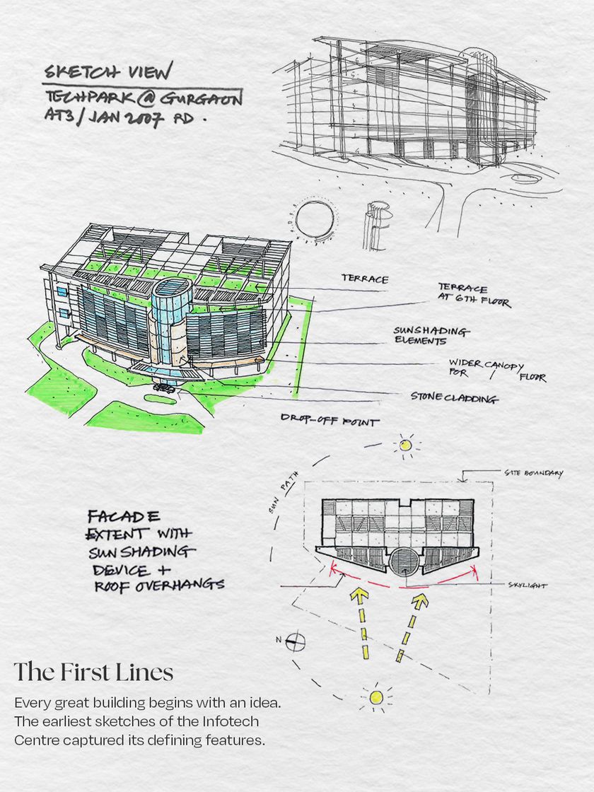 This project showcases our end-to-end design and build process for a 500,000 sq. ft. IT hub in Gurgaon. Follow the journey from the initial hand-drawn sketches and 3D models to the construction phase and the final, iconic landmark that has stood for nearly two decades.