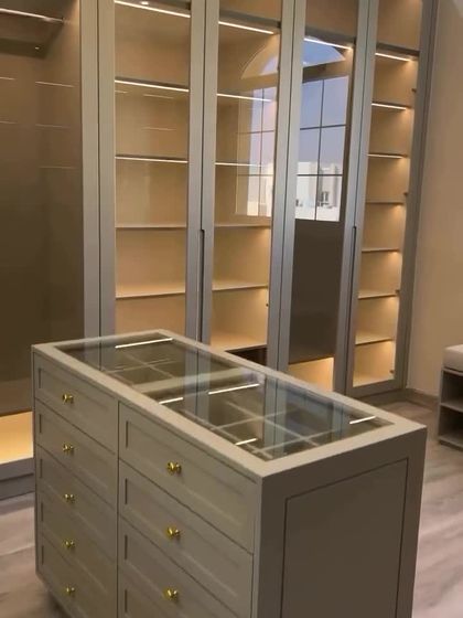 - Central Island: Custom unit with velvet-lined jewelry trays and glass top.