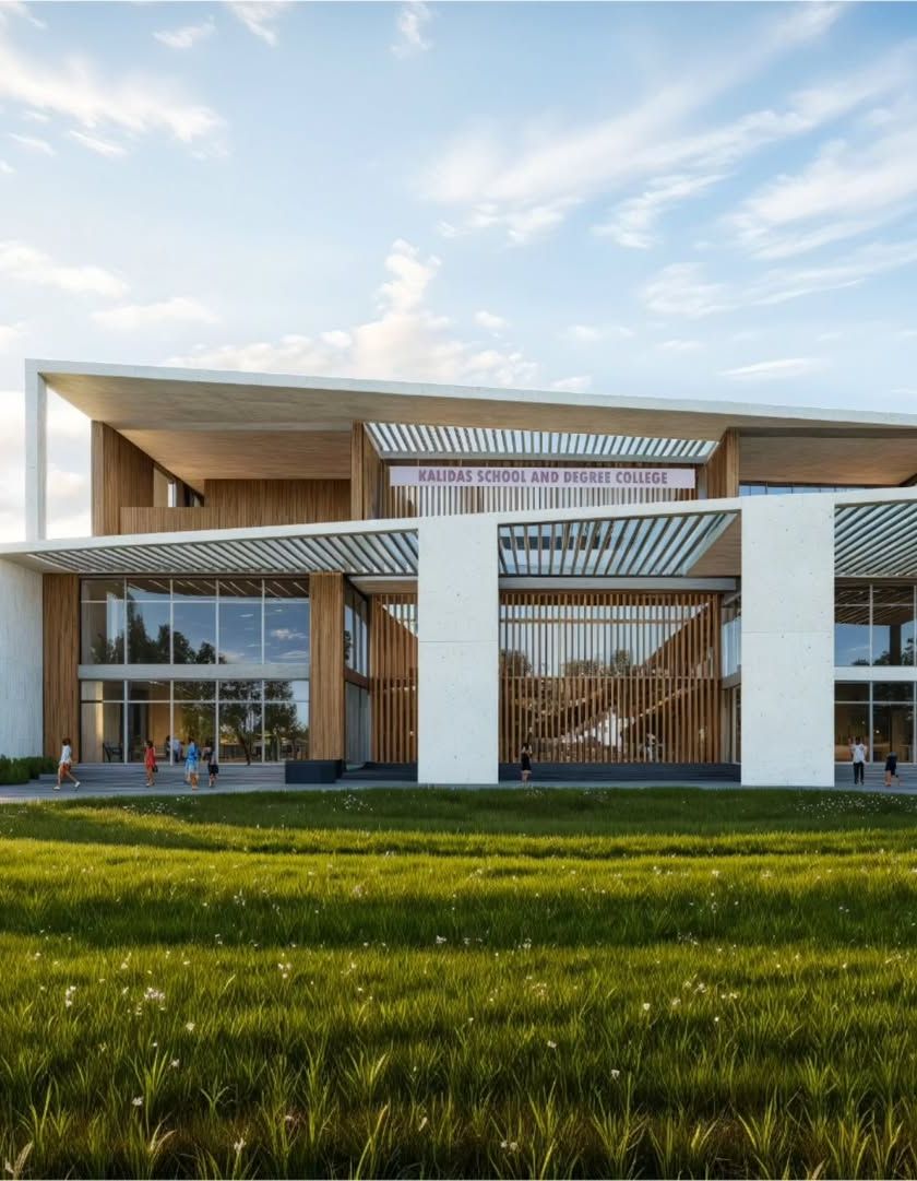 For this integrated school and degree college, our primary goal was to establish a strong sense of arrival and identity. The design is organized around a grand entrance portal with an angled pergola, which creates an inviting and memorable experience. We planned the campus on a linear site, arranging departments and classrooms around courtyards to ensure logical flow and foster a collaborative academic atmosphere.