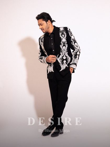 Here, I merge the sharp discipline of Western tailoring with the soul of Indian artistry. These bespoke jackets are crafted for the global man who commands attention at cocktail parties, receptions, and black-tie events with an Indo-Western dress code.