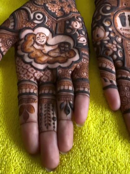 - Baby showers (Godh Bharai/Dohale Jevan) are my favourite. I love making themed baby shower mehndi with cute baby motifs, cradles, and fun messages like ‘Baby Loading’.