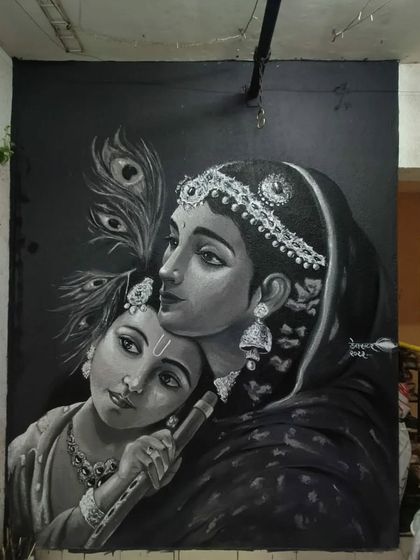 I connect with the big stories from our culture and bring them to life in large-scale murals. Using a grayscale palette, I focus on the emotion and realism of the scene, like this playful moment between Yashoda and Krishna.
