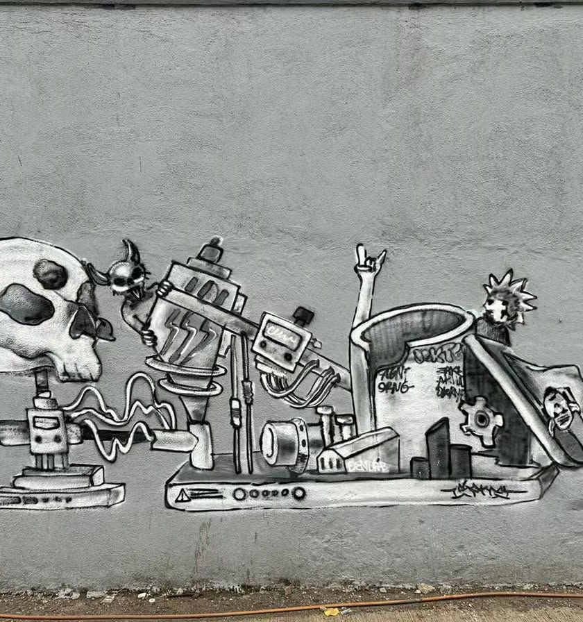 This is my signature style, inspired by heavy metal, goth culture, and mechanical details. I specialize in anti-style graffiti, creating complex pieces with skulls, abstract machinery, and dirty-style lettering.