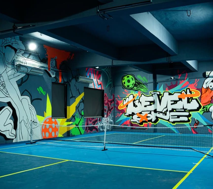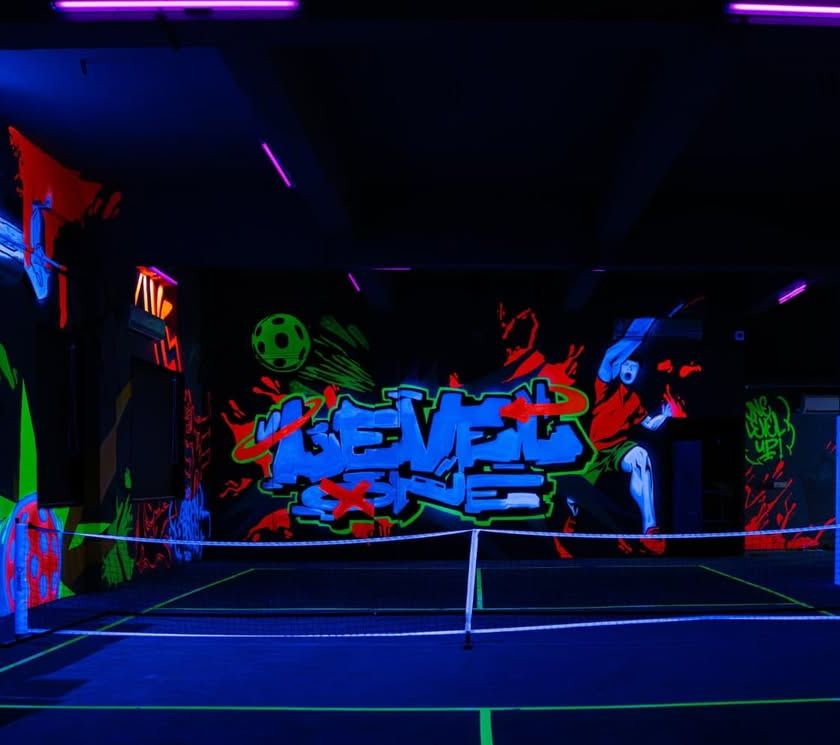 I create immersive experiences with UV and glow-in-the-dark paint, a first for a pickleball court in Mumbai. This technique is perfect for gaming arenas, entertainment zones, and any space that needs to transform after dark.
