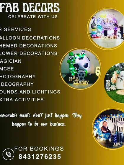Hey there! For us at D Fab Decors, it’s all about making your big day pop. We get a kick out of turning wild ideas—flamingo birthday decor, prince theme parties—into real, unforgettable moments. Whether it’s a seemantham or someone’s 70th, we pour our hearts in. It’s not just balloons and flowers, it’s about memories. So, come join hands with us, let’s make your celebration a blast. We create, you celebrate!