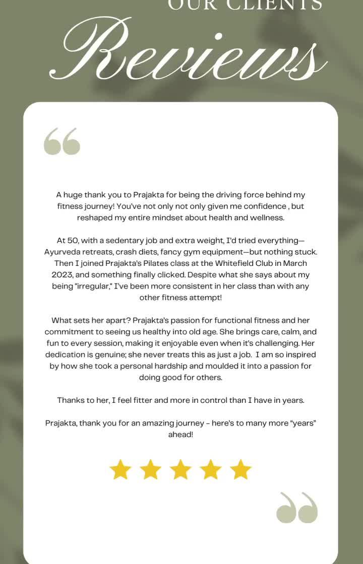 This is the first impression. This collection is curated to quickly communicate my expertise, the variety of services I offer, and the supportive community I've built. It’s a snapshot of what makes my approach to Pilates unique and effective.