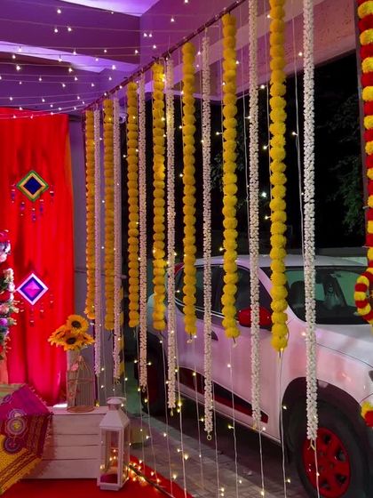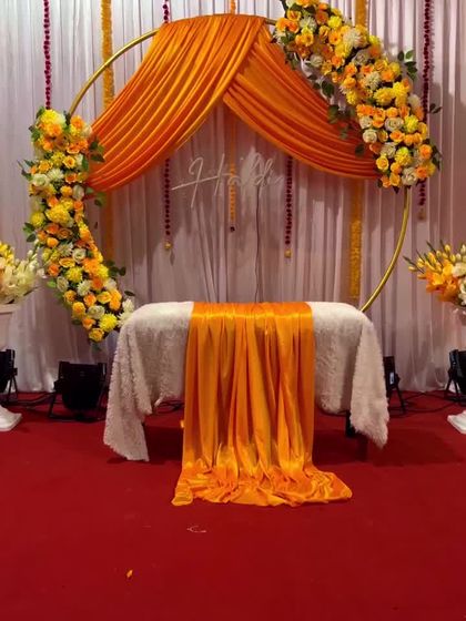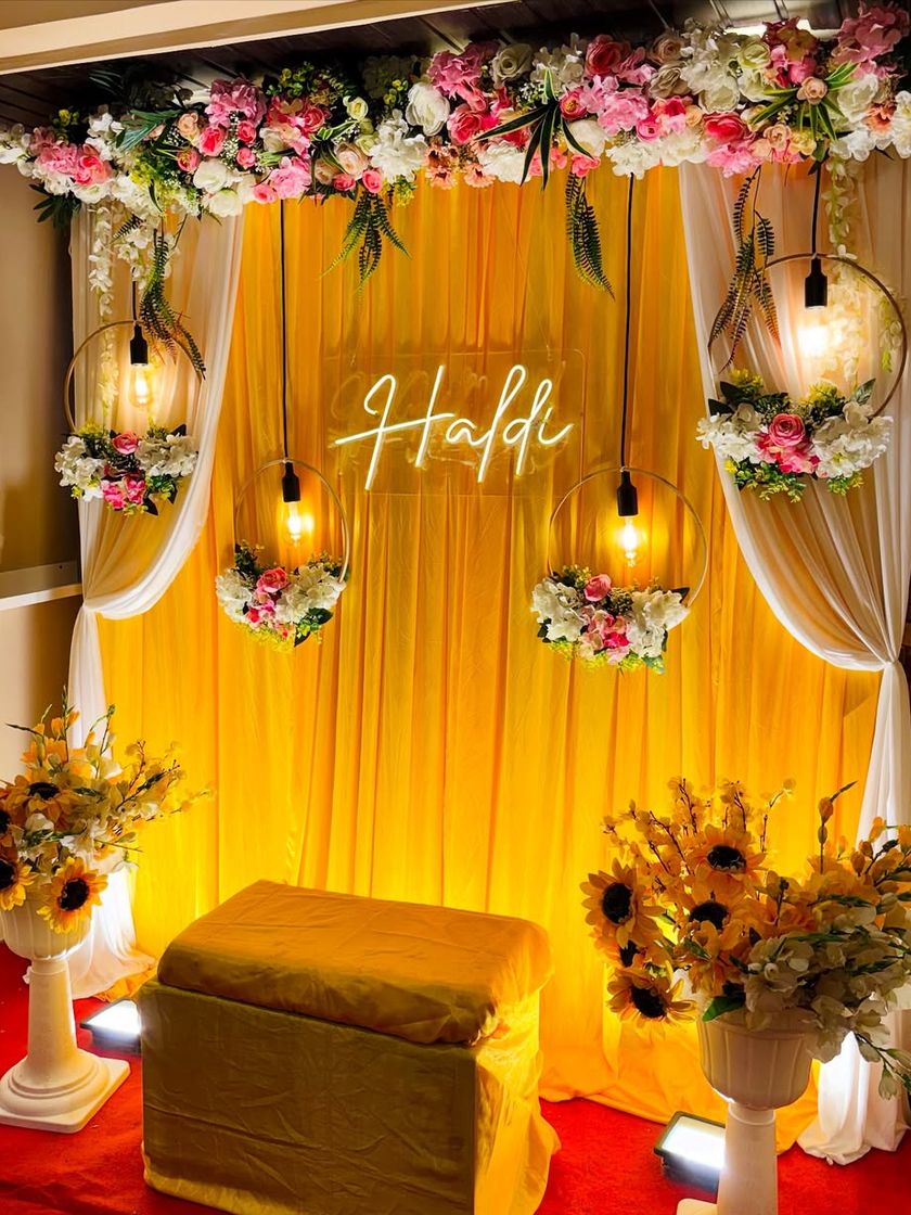 I design Haldi decor for every style and budget, perfect for turning your home or venue into a festive space. I offer everything from traditional marigold and yellow drape setups to modern, multi-colored floral backdrops with custom neon signs.