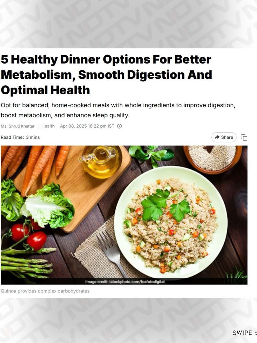 I'm honored to be a featured nutrition expert for NDTV, where I share my knowledge on topics like healthy dinner options, managing inflammation, and preventing childhood obesity.
