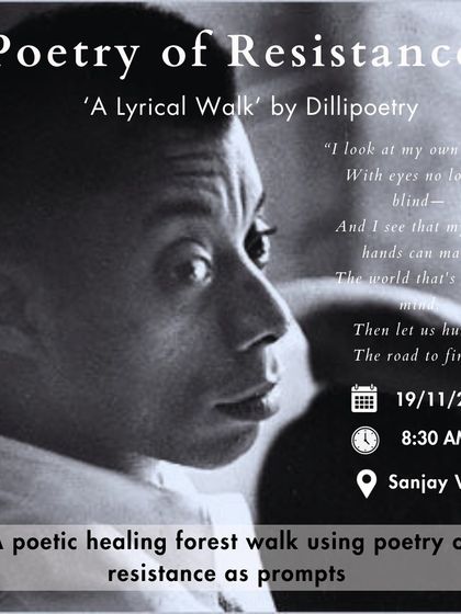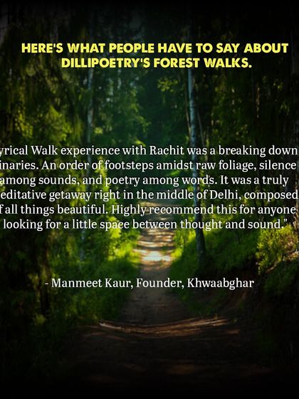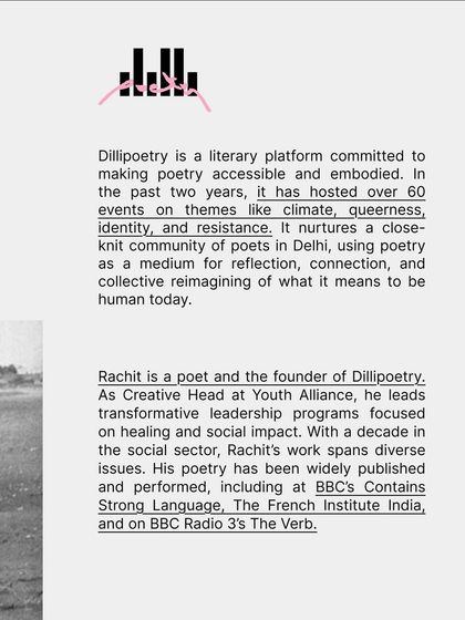 Hi, I’m Rachit, the one behind Dillipoetry. I just wanted poetry to get off the stage, into our bones, into Delhi’s air. Two years back, I started Lyrical Walks—felt poetry with feet and heart, not just words. For me, poetry is a portal: climate, queerness, identity, resistance, all tangled in verse. My words travel, but the real magic? It’s in small circles, forest walks, blank pages dented by real people, one poem at a time.