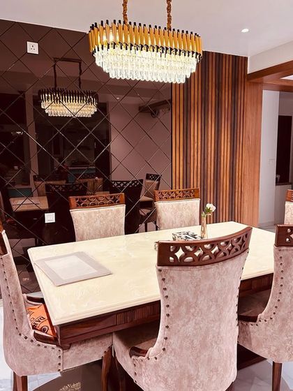 - Dining: 6-Seater Dining table with composite stone/marble top and upholstered chairs.