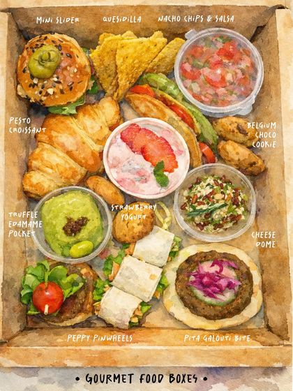 - Gourmet snack box for foodies: Mini sliders, pinwheels, pesto croissants, truffle edamame pockets, signature dips, Belgium choco cookies.
