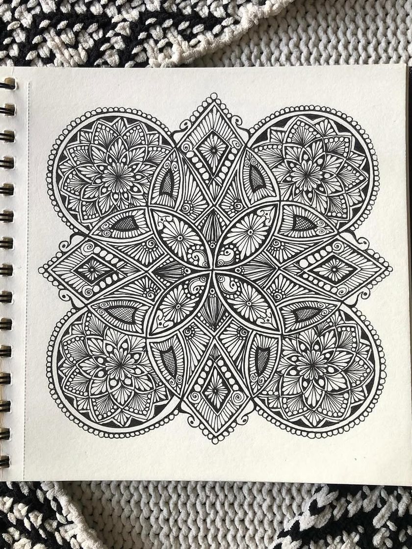 Every large mural and workshop idea starts here, with a pen and paper. This is my personal space for exploration, where I find calm and develop the intricate patterns that define my work. These designs show the foundation of my art, from simple lines to complex compositions.