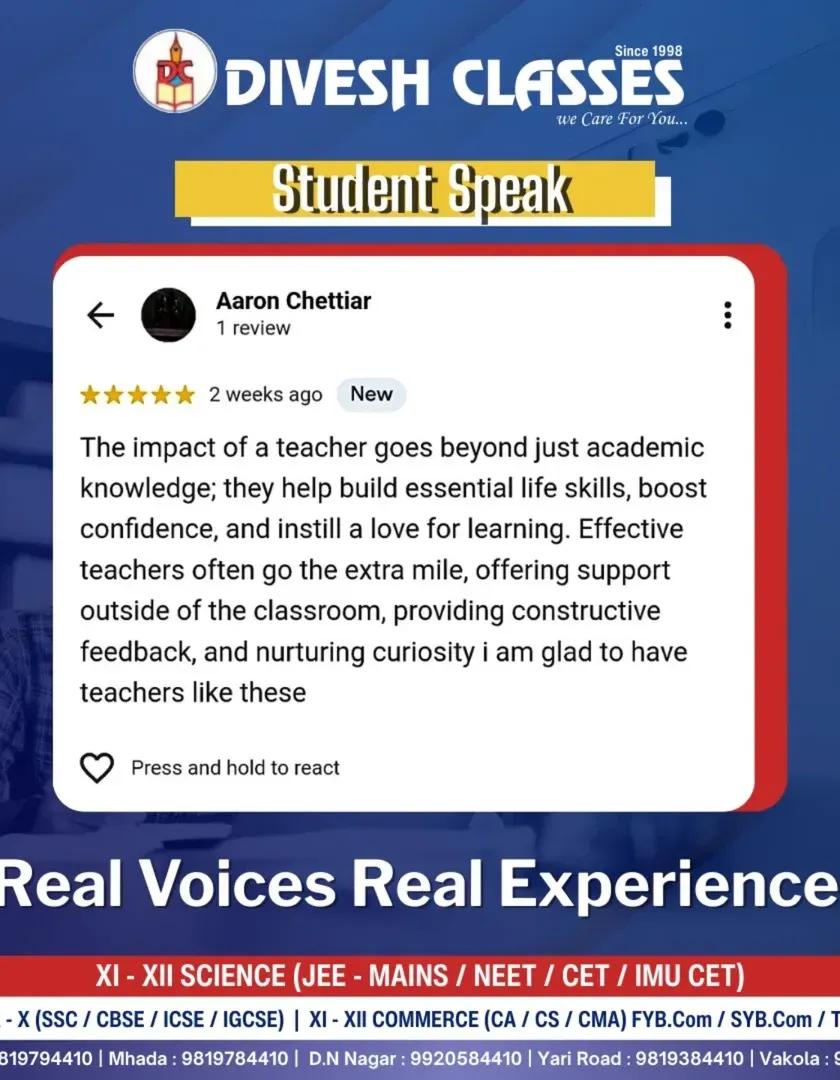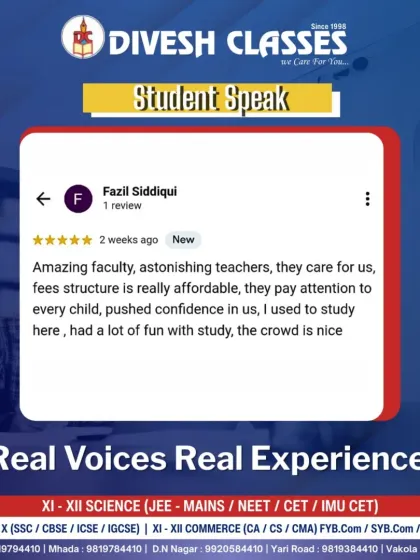 Nothing speaks louder than the words of our students. Here, they share their personal experiences about learning, friendship, and growth at Divesh Classes. These testimonials reflect the supportive and confidence-building environment we strive to create.