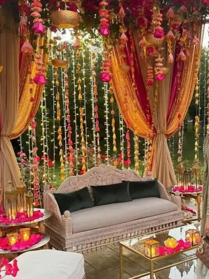 Pre-wedding functions are where the real masti (fun) happens. I plan Haldi ceremonies that are so lively, everyone’s phone is out recording. Expect bright yellow, marigolds everywhere, and setups that work whether you’re at a fancy venue or just chilling at home. For Mehendi, I go for colourful drapes, floral swings, and those little boho touches that make the photos pop.