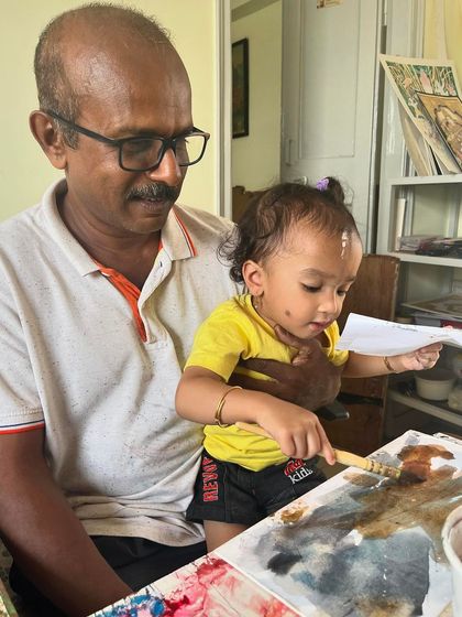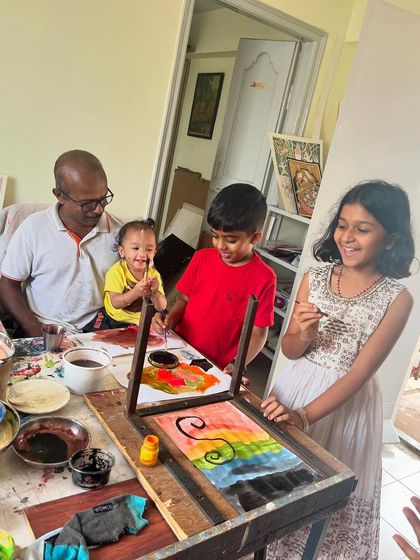 I offer weekend art classes teaching traditional Mysore painting techniques for both adults and children. Students learn the authentic methods of using gold leaf, gesso work, and watercolors while creating divine and mythological themes.