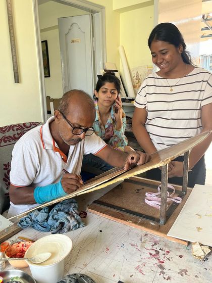 Nanu Raghavendra, Bengaluru nalli Mysore painting artist. Nange ee kale tumba ishta (I love this art a lot). 35 years ninda idu naanu maadta iddini. Slow agi, brushes jothe, gesso haaki, gold leaf hakta, meditation thara. Namma parampara, ancestors inda bandide. Karnataka State Award sigide, blessing thara anisuthe. My daughter Amulya helps with online stuff, English translation kooda. Sometimes I try new ideas - Elon Musk portrait kooda maadide! But, best part? When my painting sits in someone’s pooja room, it feels like sharing a blessing.