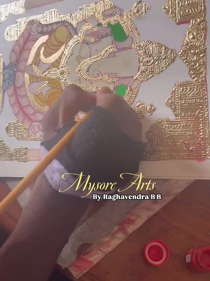 Nanu Raghavendra, Bengaluru nalli Mysore painting artist. Nange ee kale tumba ishta (I love this art a lot). 35 years ninda idu naanu maadta iddini. Slow agi, brushes jothe, gesso haaki, gold leaf hakta, meditation thara. Namma parampara, ancestors inda bandide. Karnataka State Award sigide, blessing thara anisuthe. My daughter Amulya helps with online stuff, English translation kooda. Sometimes I try new ideas - Elon Musk portrait kooda maadide! But, best part? When my painting sits in someone’s pooja room, it feels like sharing a blessing.