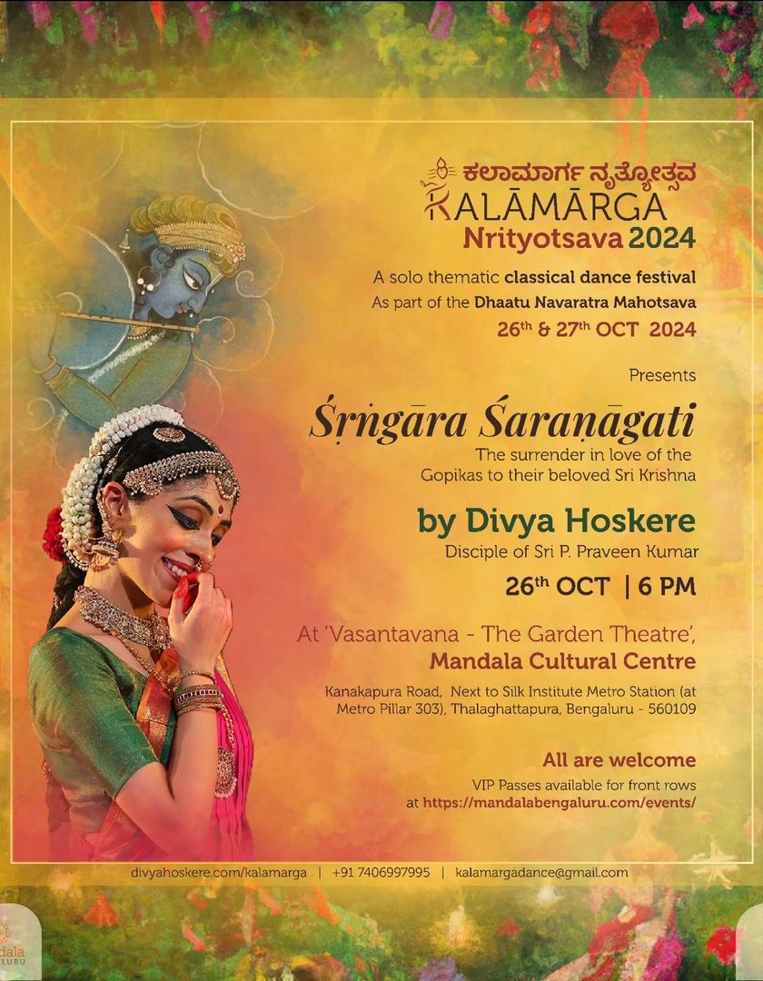 My signature solo production tells the enchanting love story of Krishna and the Gopikas from the Srimad Bhagavatam. This performance explores themes of devotion and playful surrender through expressive abhinaya and intricate nritta, all set to a live orchestra.