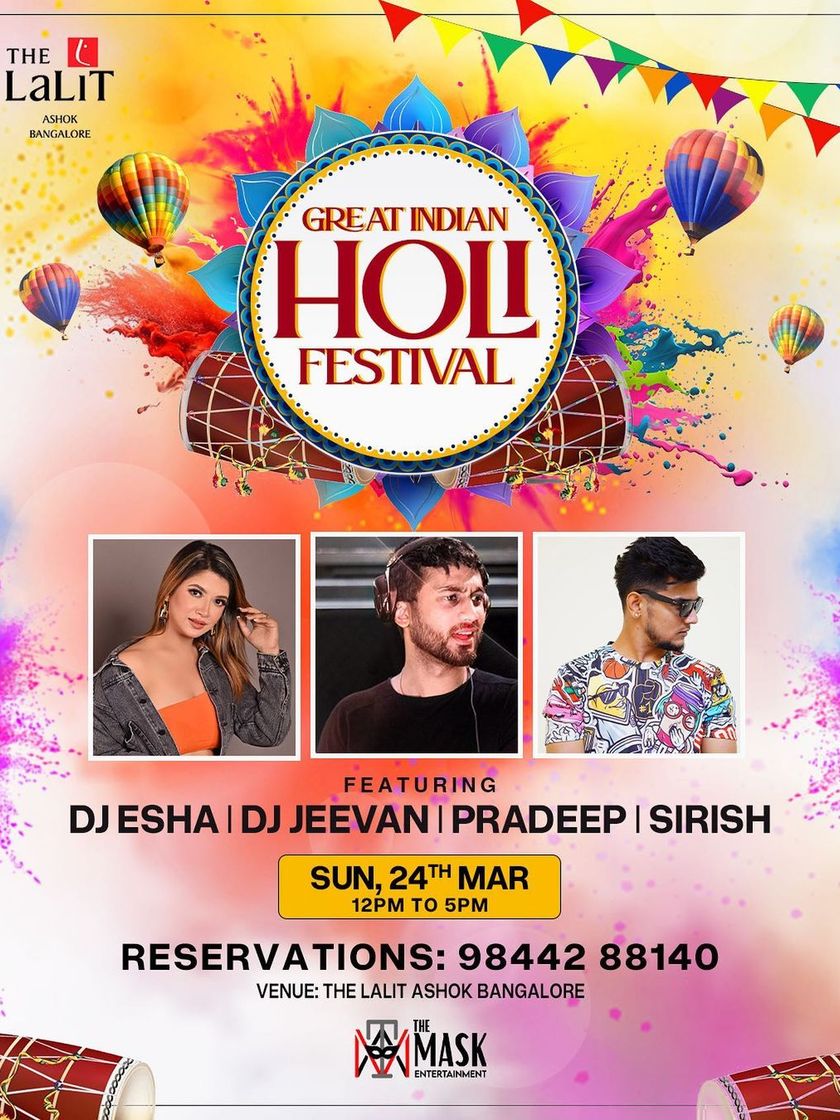 As a Holi party specialist, I create the ultimate festival of colors with high-energy Bollywood and Bhangra music. These are typically large-scale, outdoor daytime events at venues like Pebble Palace Grounds and The Lalit Ashok.