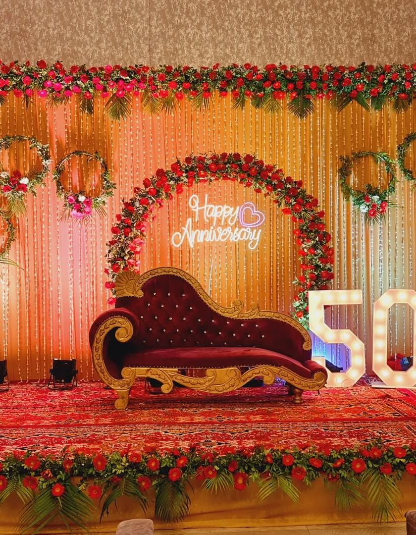 I design elegant and celebratory decor for engagements, ring ceremonies, and milestone anniversaries. I provide complete solutions including stage backdrops, floral arrangements, guest table centerpieces, and custom lighting.