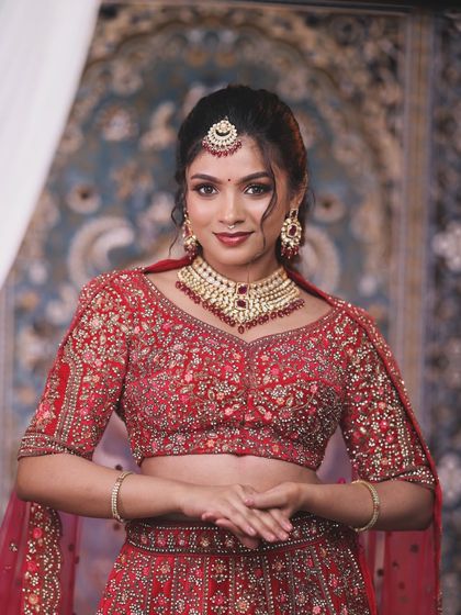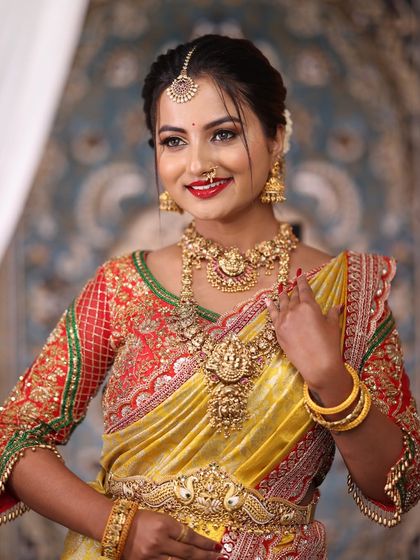 This is my signature collection for the traditional South Indian bride. You'll find complete rental sets featuring antique gold-finish temple jewellery, including layered harams, Kasu Malas, chokers, and matching accessories, all designed to give you a divine look on your wedding day.