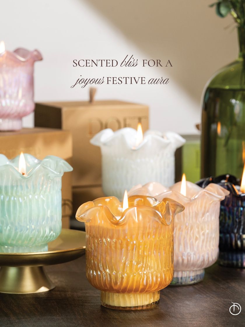 I believe fragrance should also spark joy and delight. This collection features candles in a kaleidoscope of colors and imaginative shapes, from vintage-inspired sundae glasses to iridescent lotus votives. These pieces are designed to be conversation starters and add a lively pop of color to your home.