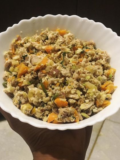 Mostly chicken, mutton, or fish, with veggies like pumpkin, broccoli, and sweet potato. I mix in eggs and supplements for a balanced diet. I also offer grain-free dog meals if your pup’s tummy needs it.