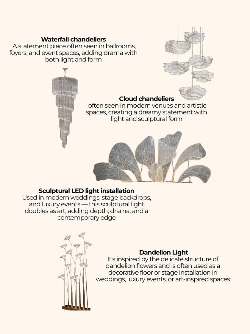 For me, lighting is not just about illumination; it's about creating an atmosphere and evoking emotion. From the grandeur of crystal chandeliers to the intimacy of a thousand candles or the whimsy of a fairy light tunnel, I use light as a tool to paint a space, set the tone, and bring the entire design to life.