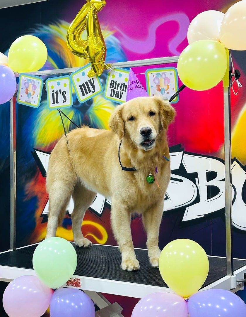 I create a complete birthday experience for your pet at my parlour in Whitefield. Each celebration includes a full grooming session and a photoshoot with a custom setup, including balloons, banners, and our unique graffiti wall backdrop.