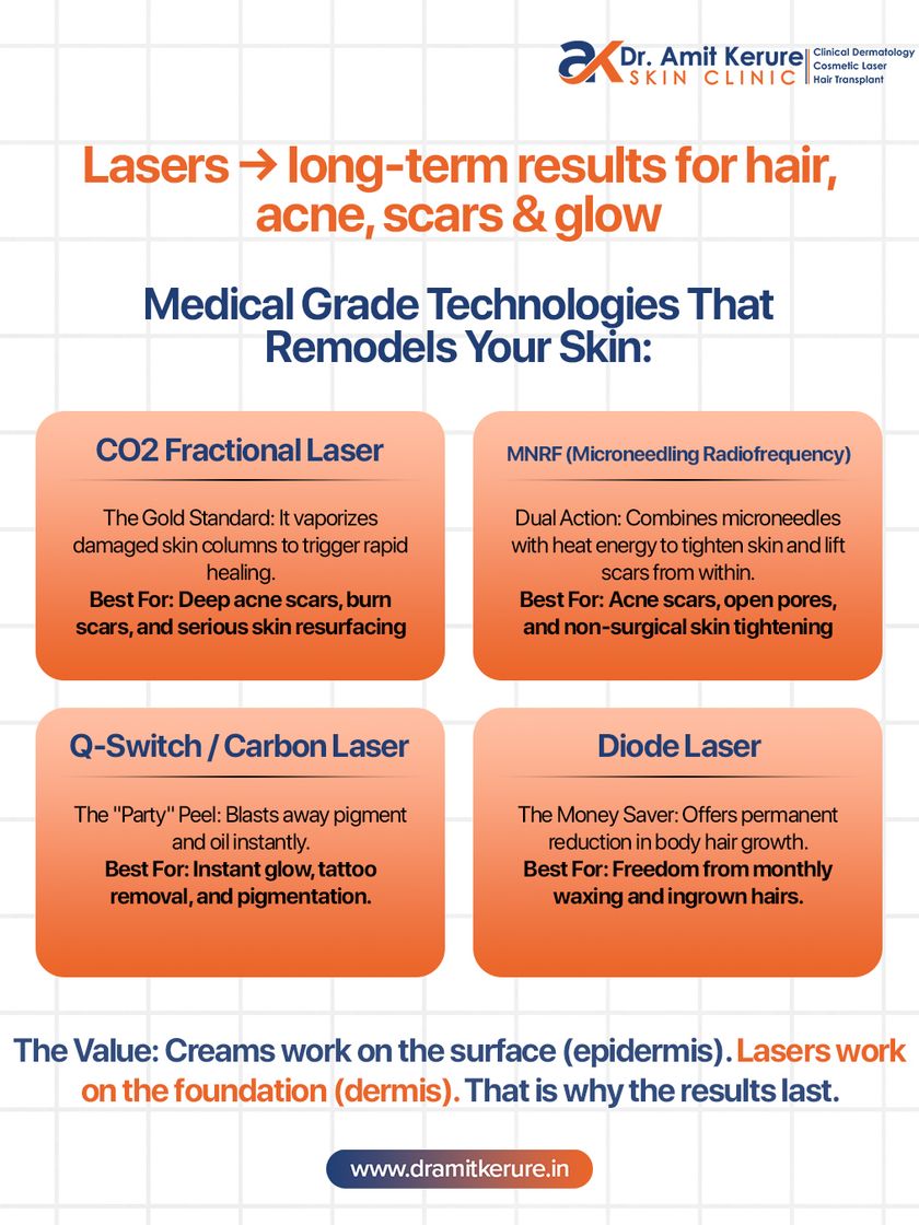 I use US FDA-approved technologies like CO2 Fractional Laser and Microneedling Radiofrequency (MNRF) to treat deep acne scars, open pores, and signs of aging. These treatments work by remodeling collagen deep within the skin for lasting results.