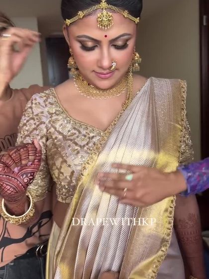 This is where my passion lies. I specialize in authentic draping for traditional ceremonies, including the Kerala mundu and the Iyer panchakacham veshti. My technique ensures every pleat is perfect and the drape remains secure from the first ritual to the last.