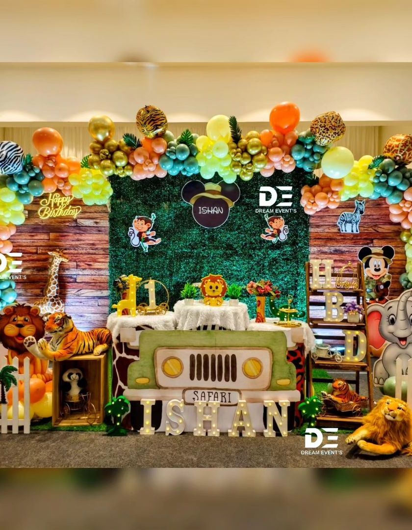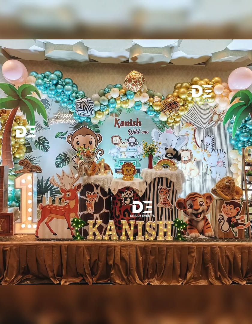 Let's go on a wild adventure! I create immersive jungle and safari experiences with themes like 'Wild One', featuring lush greenery backdrops, animal print details, and friendly character cutouts of lions, monkeys, giraffes, and tigers. These setups are perfect for curious explorers of any age.