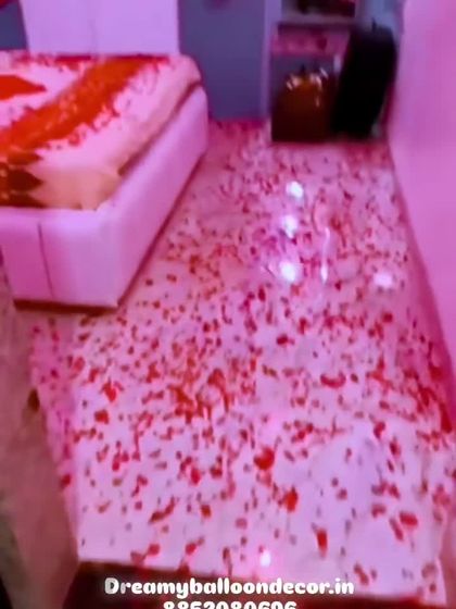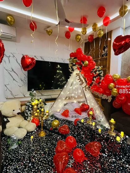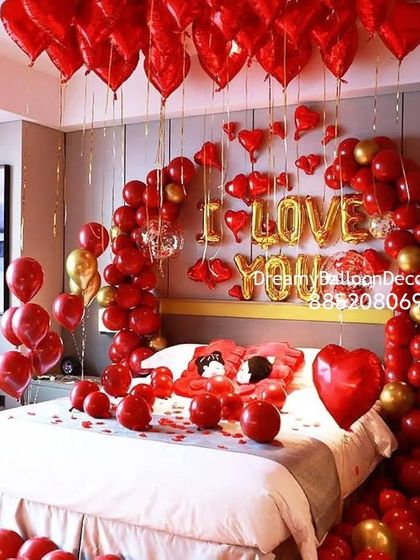 Setting up the room for your special night is my favorite part. I go all out with canopies of sheer fabric and fairy lights above the bed, petals spelling out names or big hearts, and a trail of roses leading you in. Balloons fill up the floor, and safe electric candles give that soft glow. Foil balloons with custom messages or heart shapes? Always. You pick the words, I make it happen.