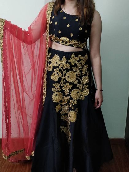 - Classic black-gold lehenga with a pop of red dupatta