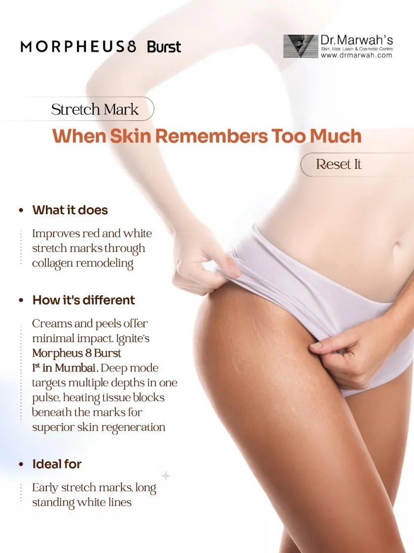 This section focuses on my specialized treatment for stretch marks, a common concern that is difficult to treat with topical products. I utilize Morpheus8 Burst, a pioneering technology in Mumbai, to rebuild the skin's structure from within for superior regeneration.