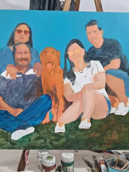 I make hand-painted acrylic portraits from your photos, focusing on real details and personality, with progress updates and options for individuals, groups, or pets.