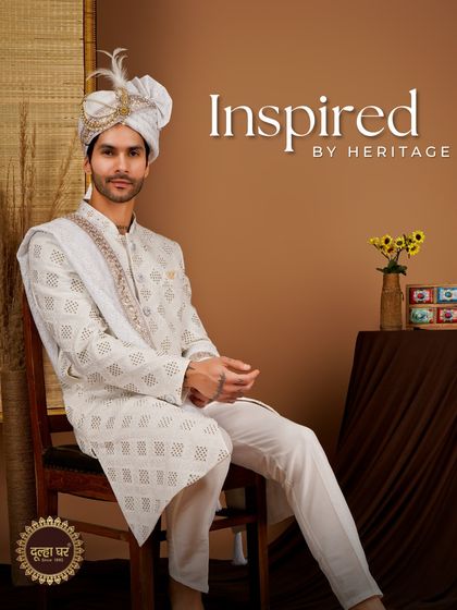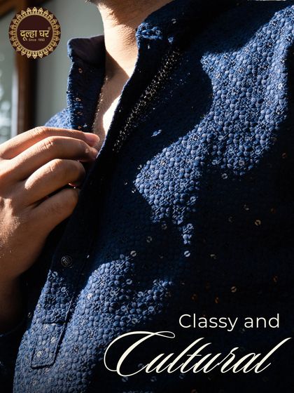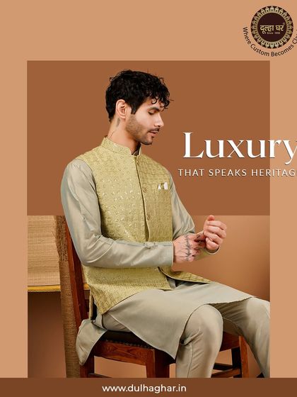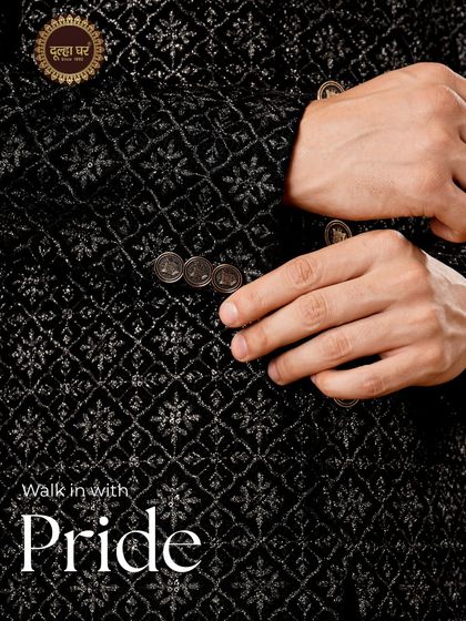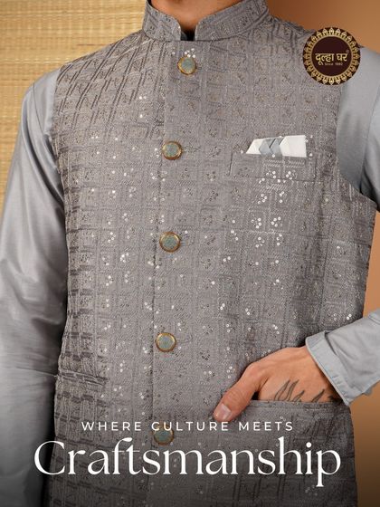 We are Dulha Ghar - Groom’s Home since ‘92. For us, a sherwani isn’t just fancy cloth, it’s a slice of history. We get our kicks from old Mughal styles, mixing that royal vibe with today’s swagger. Grooms deserve to feel as grand as the big day itself, so we stitch memories into every outfit. Not just dressing up, we’re making you feel like a king, yaad rakhna (remember that).