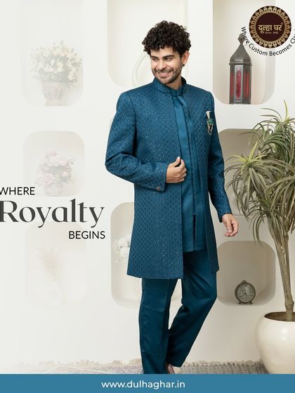 We create custom men's ethnic and fusion wear, from Mughal-inspired sherwanis to modern suits. Our focus is on blending royal heritage and premium fabrics with contemporary comfort and style.