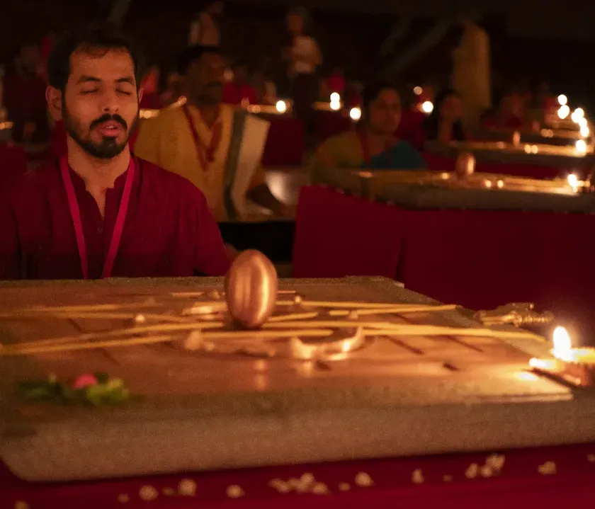 Our studio is more than just a room; it is a consecrated space, energized by the presence of Sadhguru Sannidhi and the Devi Avigna Yantra. This sacred atmosphere, nurtured through regular poojas and abhishekam rituals, is designed to deepen your practice and allow you to experience profound stillness and devotion.