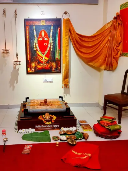 Our studio is more than just a room; it is a consecrated space, energized by the presence of Sadhguru Sannidhi and the Devi Avigna Yantra. This sacred atmosphere, nurtured through regular poojas and abhishekam rituals, is designed to deepen your practice and allow you to experience profound stillness and devotion.