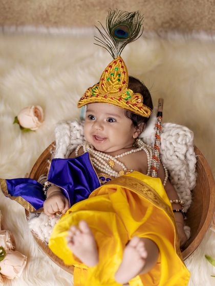 Celebrate tradition with our magical Janmashtami photoshoots. We dress your little ones as adorable Krishnas and Radhas, complete with crowns, flutes, and festive props. These themed sessions are full of joy and create timeless memories.